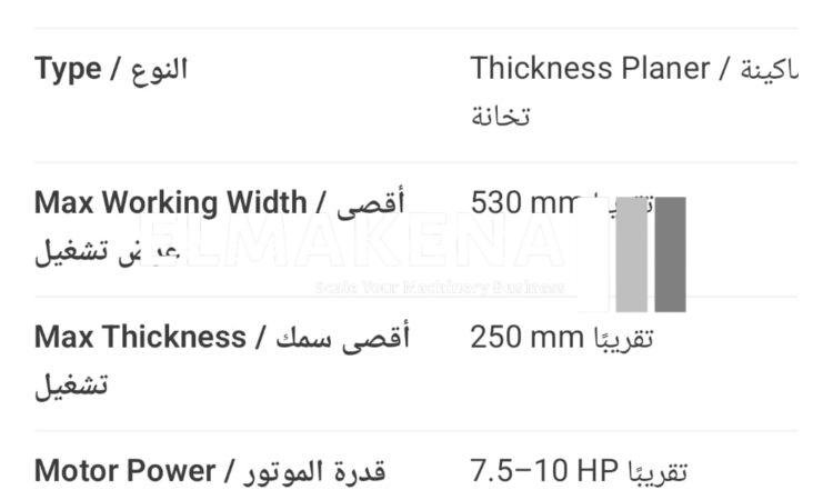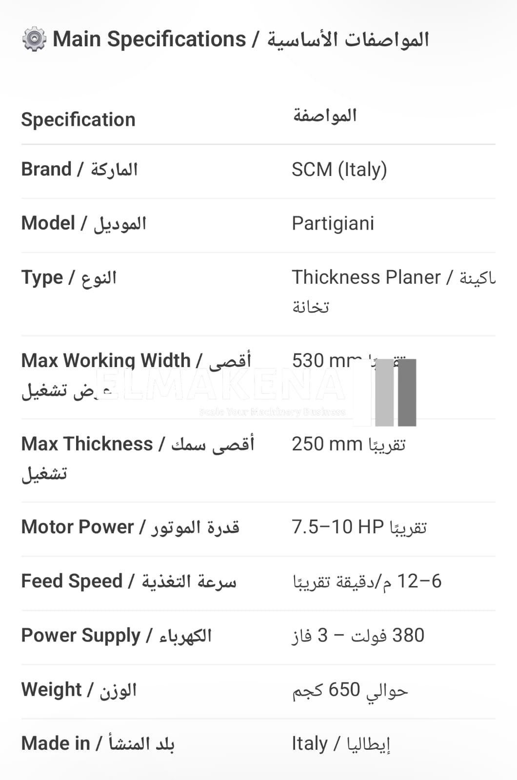 بارتيجاني هي ماكينة تخانة إيطالية الصنع تتميز بالقوة والدقة في تسوية أسطح الأخشاب. هيكلها متين من الحديد الزهر مع رفع يدوي للطاولة ومحرك قوي يناسب التشغيل المستمر في الورش والمصانع